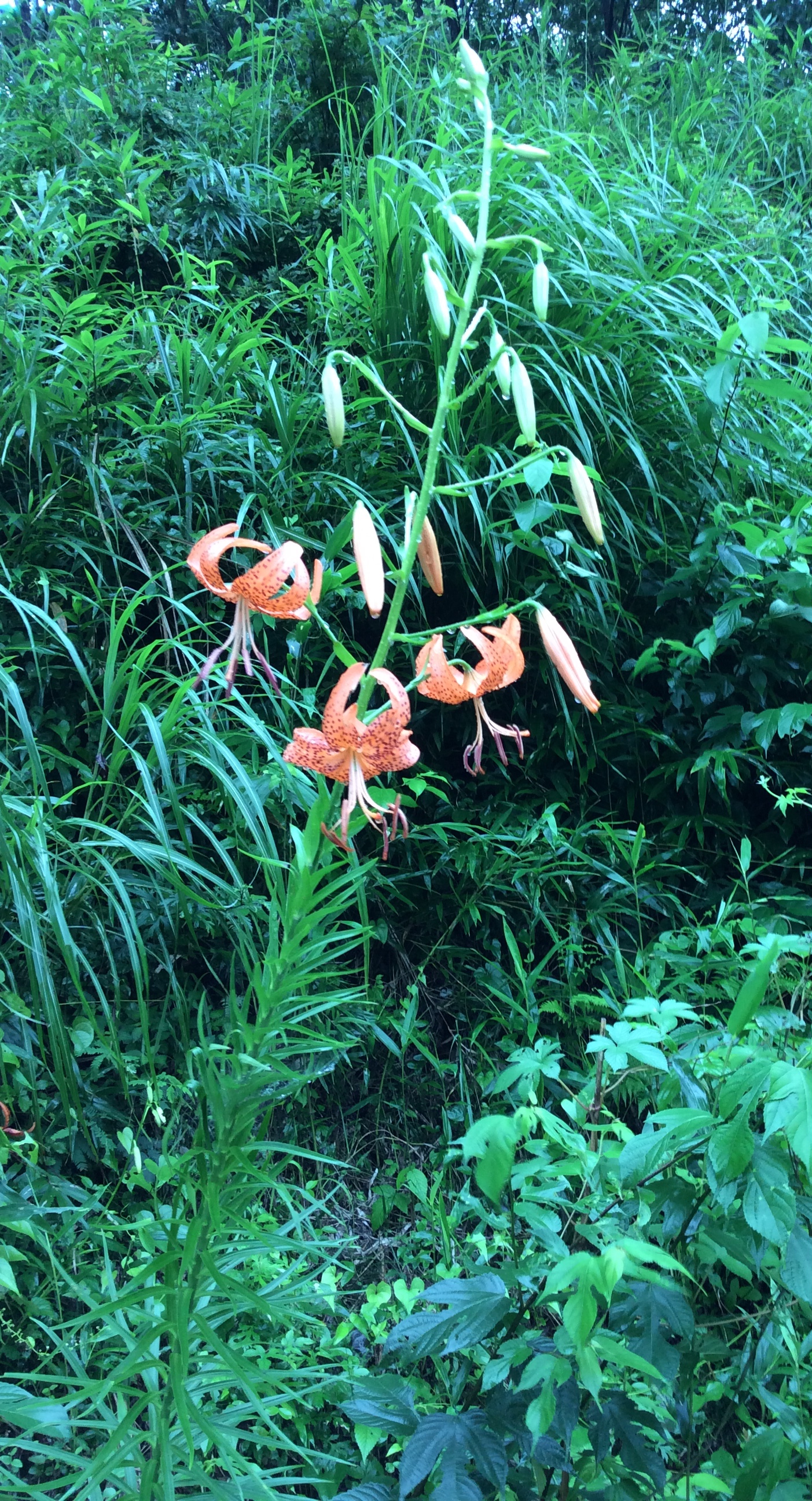 今日の写真はコオニユリ。竹田地方には沢山自生しています。ヤマユリと違って繁殖力が強くすぐ増えます。花は綺麗ですが、ありふれた花ですので人もあまり採らないですね。コオニユリがあるならオニユリはあるのか?あります。両者の鑑別は非常に難しい。普通、葉のつけ根にムカゴがあるかないかで鑑別します。あるのがオニユリ、ないのがコオニユリ。竹田地方にはヤマユリ、ウバユリ、コオニユリの他にカノコユリがあります。ただカノコユリは非常に少ない。カノコユリは九州の西側に多いですね。5年ほど前、鹿児島県の離島、甑島に行きましたが、その島は二種類の色のカノコユリで島全体が覆われていました。甑島は世界で一番ユリの多い所ではないでしょうか。写真はコオニユリ。