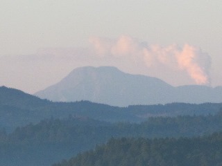朝の気温が低いと中岳の噴煙は明瞭だ。私の生家からもよく見えた。子供の頃、かなり大きな爆発を起こし、それを見るために夜、小高い丘に登ったことを記憶している。生まれた時から六十余年、私は阿蘇山の煙をずっと見続けている。(久住山の仙人)