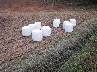 この時期、田んぼに白いビニールの大きなロール状の物体が数個転がっているのが見られる。