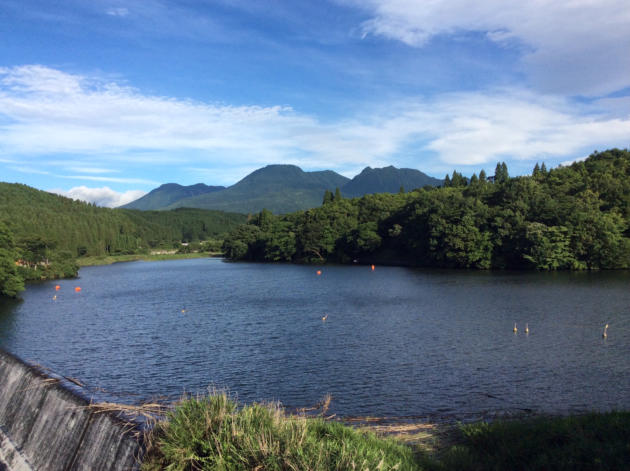 ①長湯ダム(写真):ダム湖と連山の対比が素晴らしい