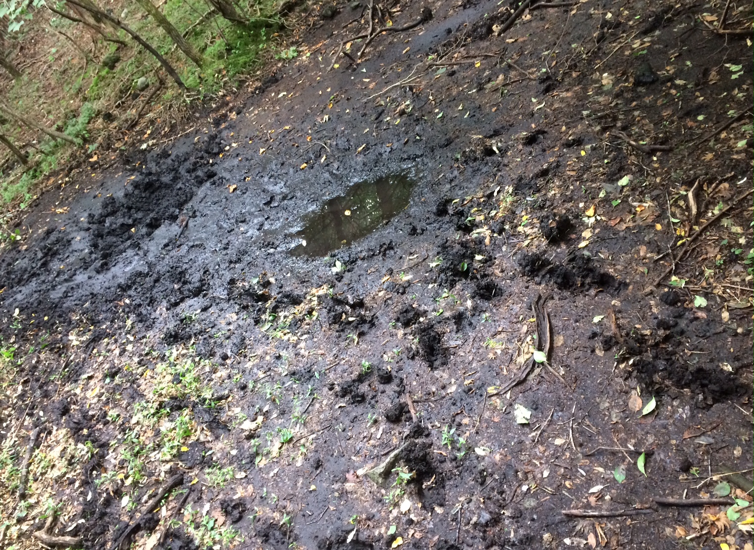 写真は登山道の脇で見つけたイノシシのヌタ場。