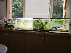 メダカ(楊貴妃)、アカミナミエビ、アカヒレ(熱帯魚)に代えた。